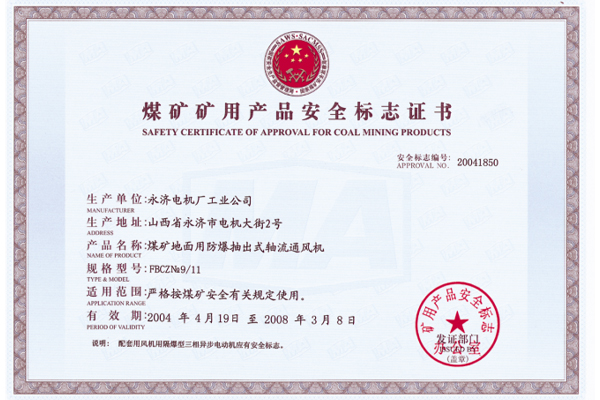 煤礦礦用產(chǎn)品安全標(biāo)志證書
